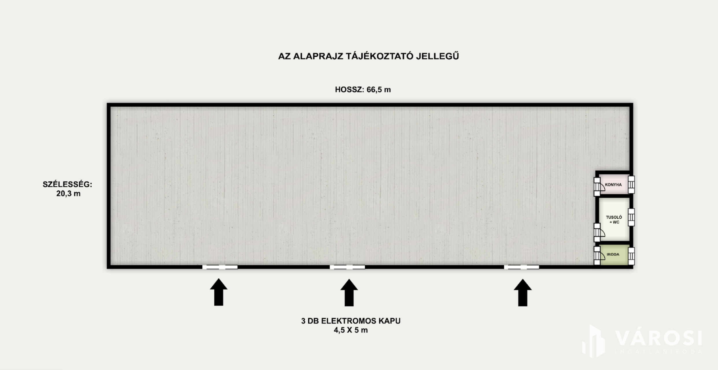Az épület: 20,3 m széles × 66,5 m hosszú, melyben kialakításra kerül 70 m2-es belső rész: iroda és szociális helyiség.