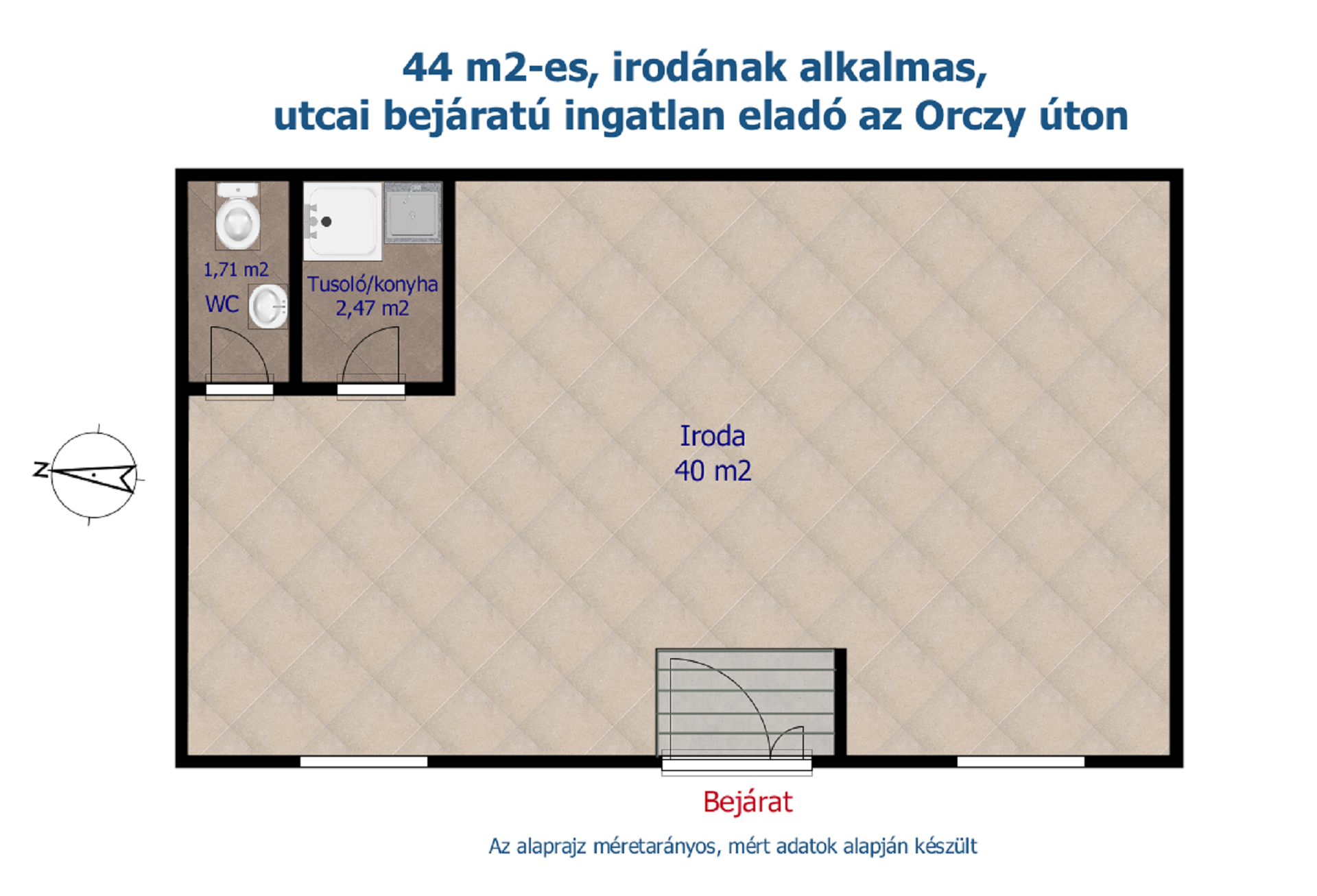 A fotók között látható alaprajz szerinti elrendezésben a 44 m2-es térből leválasztásra került egy mosdó és egy tusoló/konyha funkciót ellátó helyiség, amelyek egy iroda vagy üzlet funkcionális és higiéniai szempontjainak teljesen megfelelnek.
