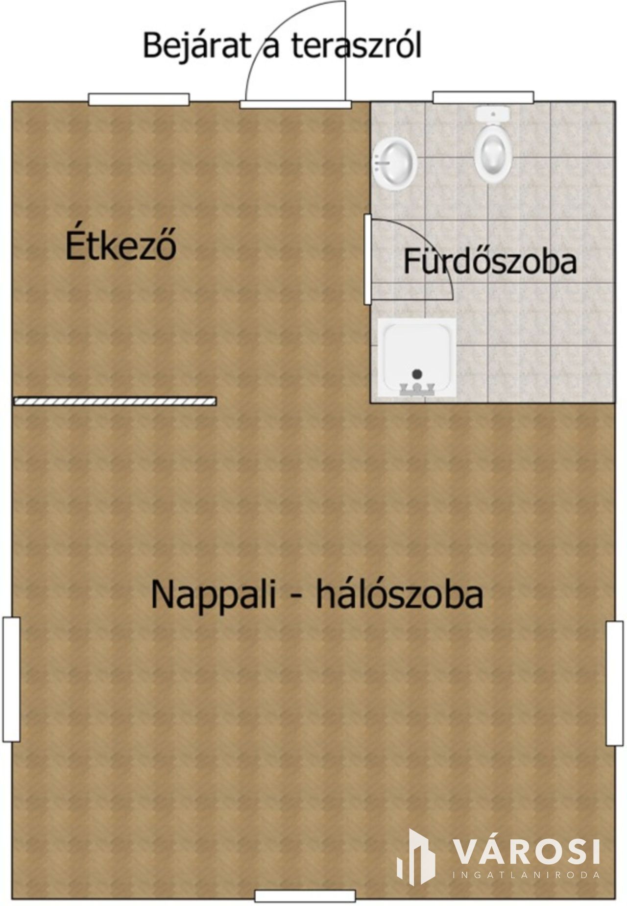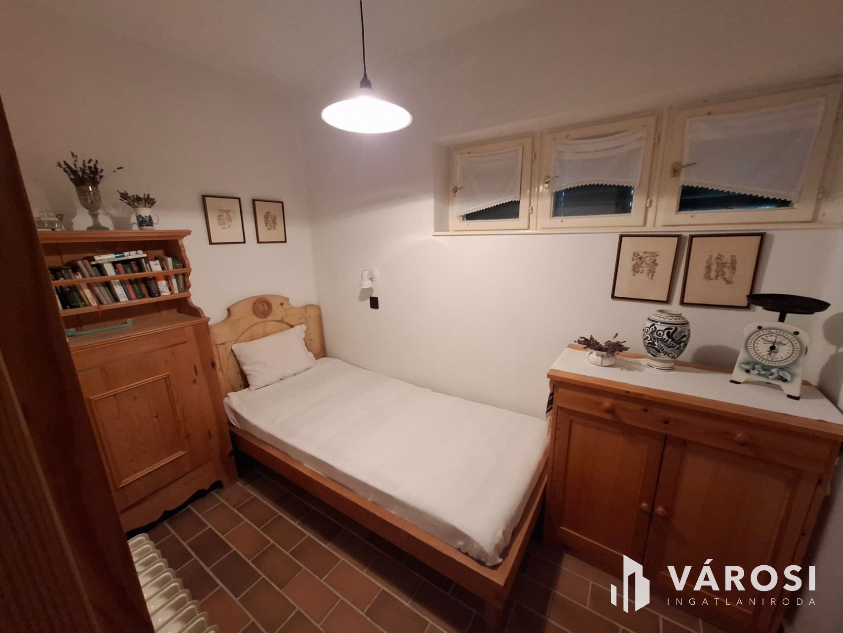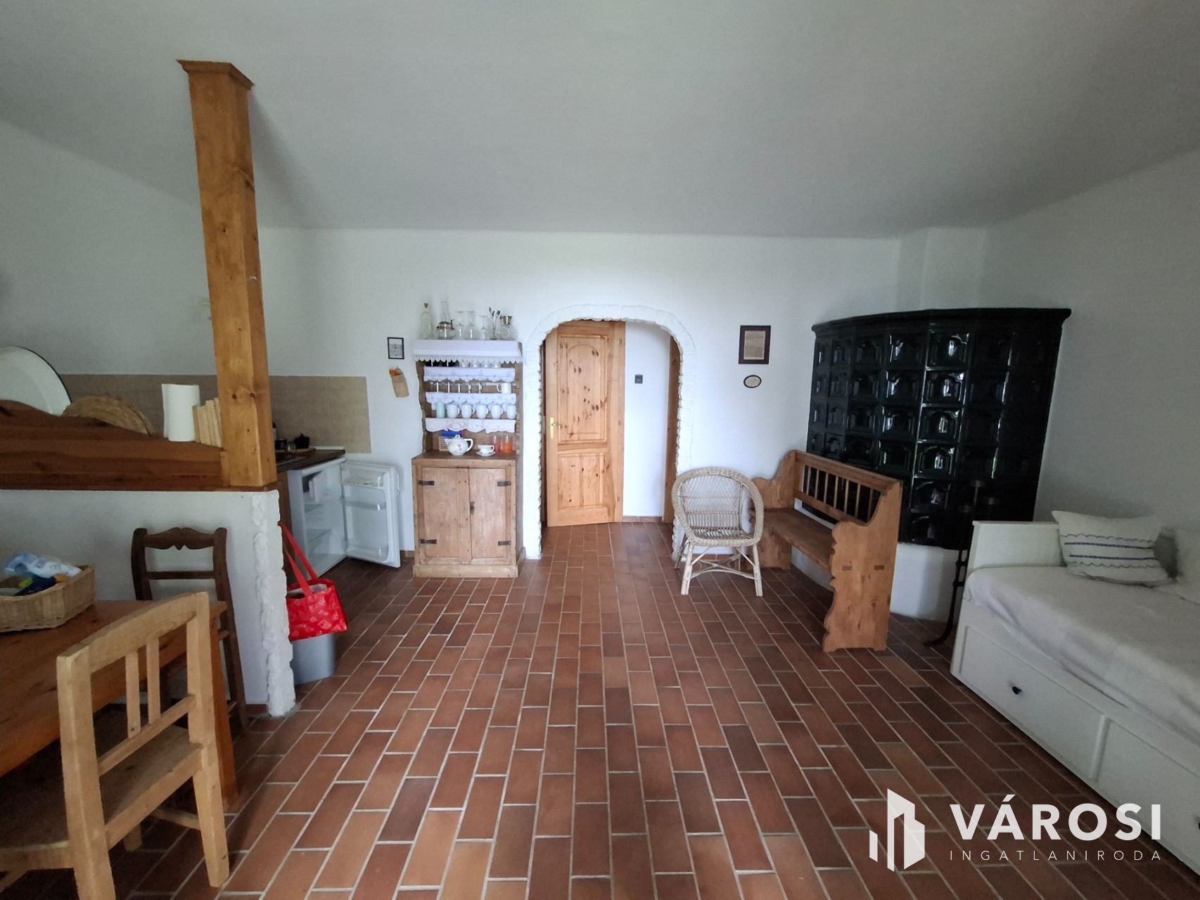 Az alsó részen fedett kocsibeálló, kerti sütő és pihenőterasz található; az épületben amerikai konyhás nappali, fürdőszoba és két félszoba van, cserépkályhával fűtve.