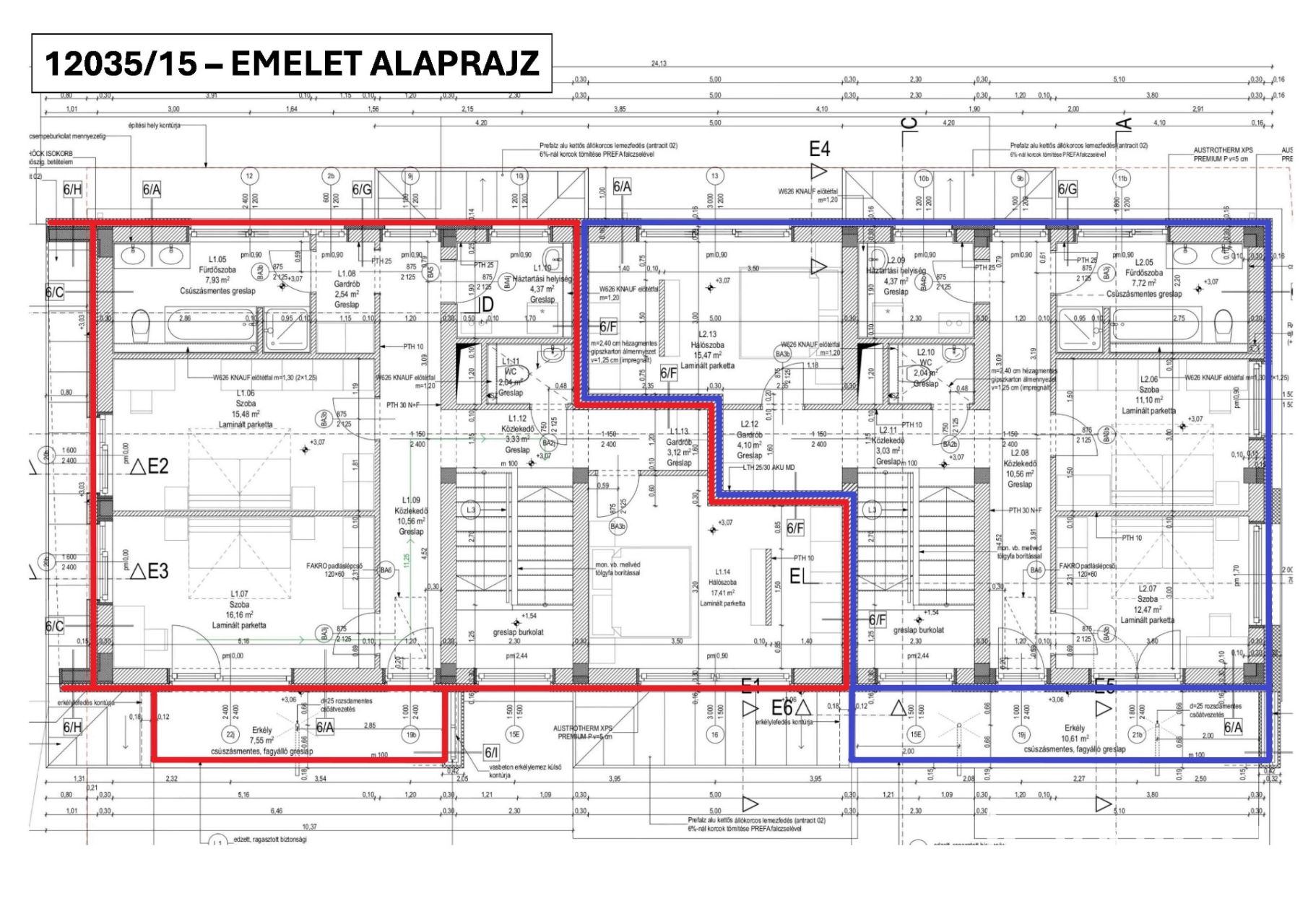 - Főfalak: Porotherm 30N+F tégla, 20cm-es grafit szigetelést kap