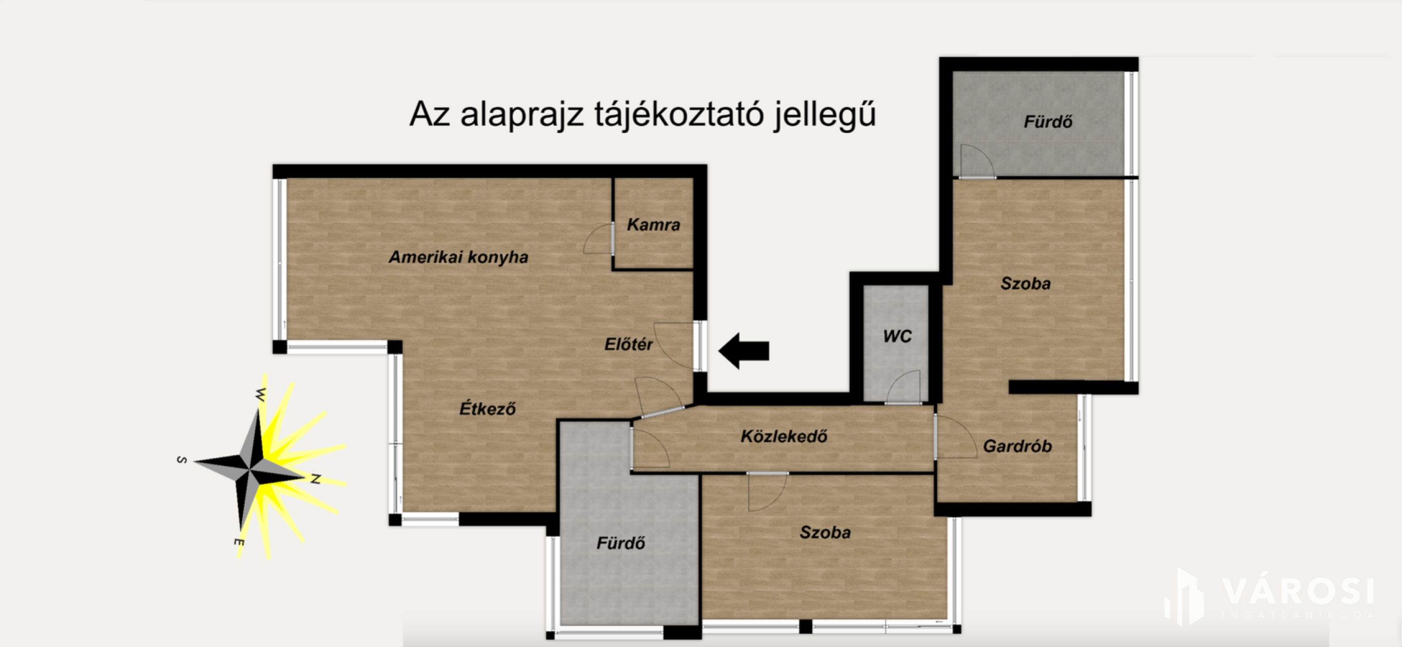 - amerikai konyhás nappali, 2 hálószoba + gardrób, kamra, 2 fürdőszoba, vendég WC