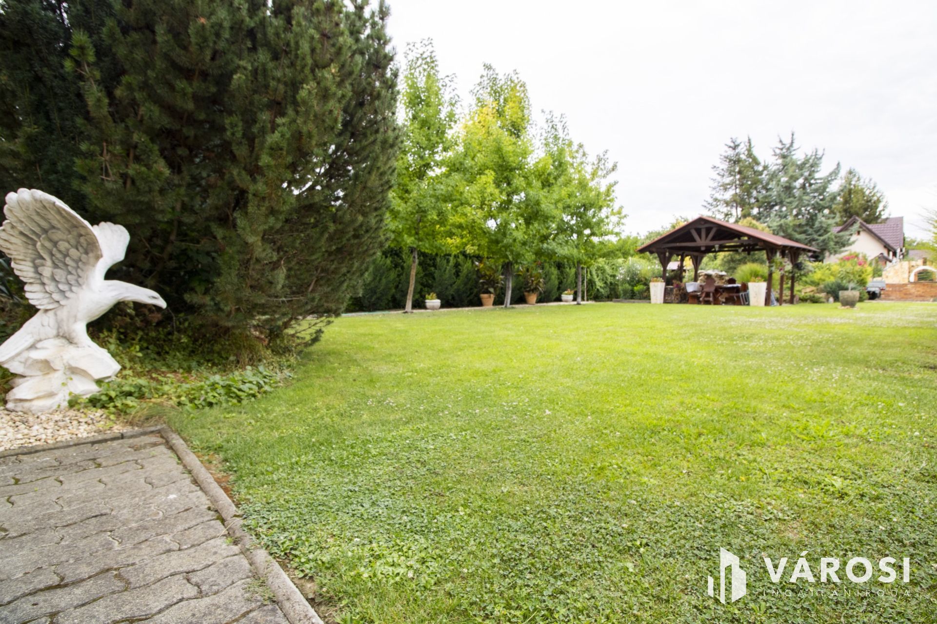 A kert maga a kikapcsolódás szigete: profin parkosított első és hátsó kert, 8*4 m-es úszómedence vízforgatóval, tisztítóval, pihenő-, napozóterasszal, hangulatos 20 m²-es kerti pavilon, grillező, kemence, halastó csobogókkal és két fúrt kút is helyet kapott.