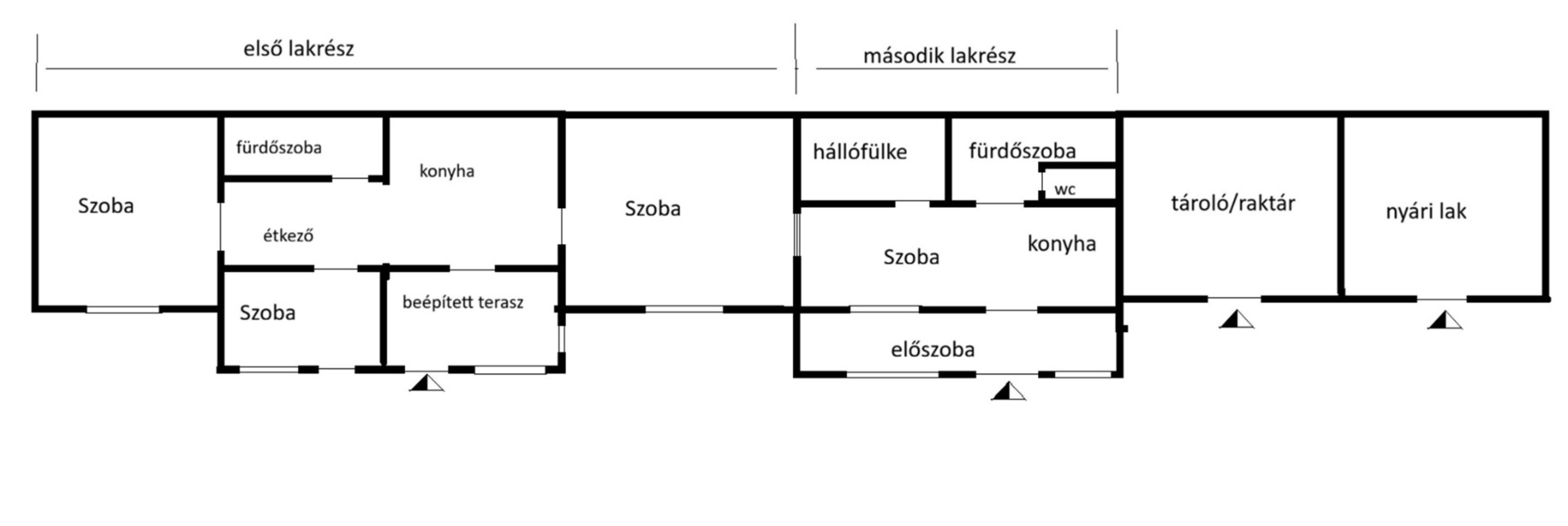 Egy 80 nm-es nappali+2 szobás házrész, valamint egy 60 nm-es 1 szoba+hálófülkés lakrész. A két lakrész közötti nagy szoba -mely most az elsőhöz tartozik - igény szerint egy ajtó nyitásával a hátsó kislakáshoz kapcsolható.