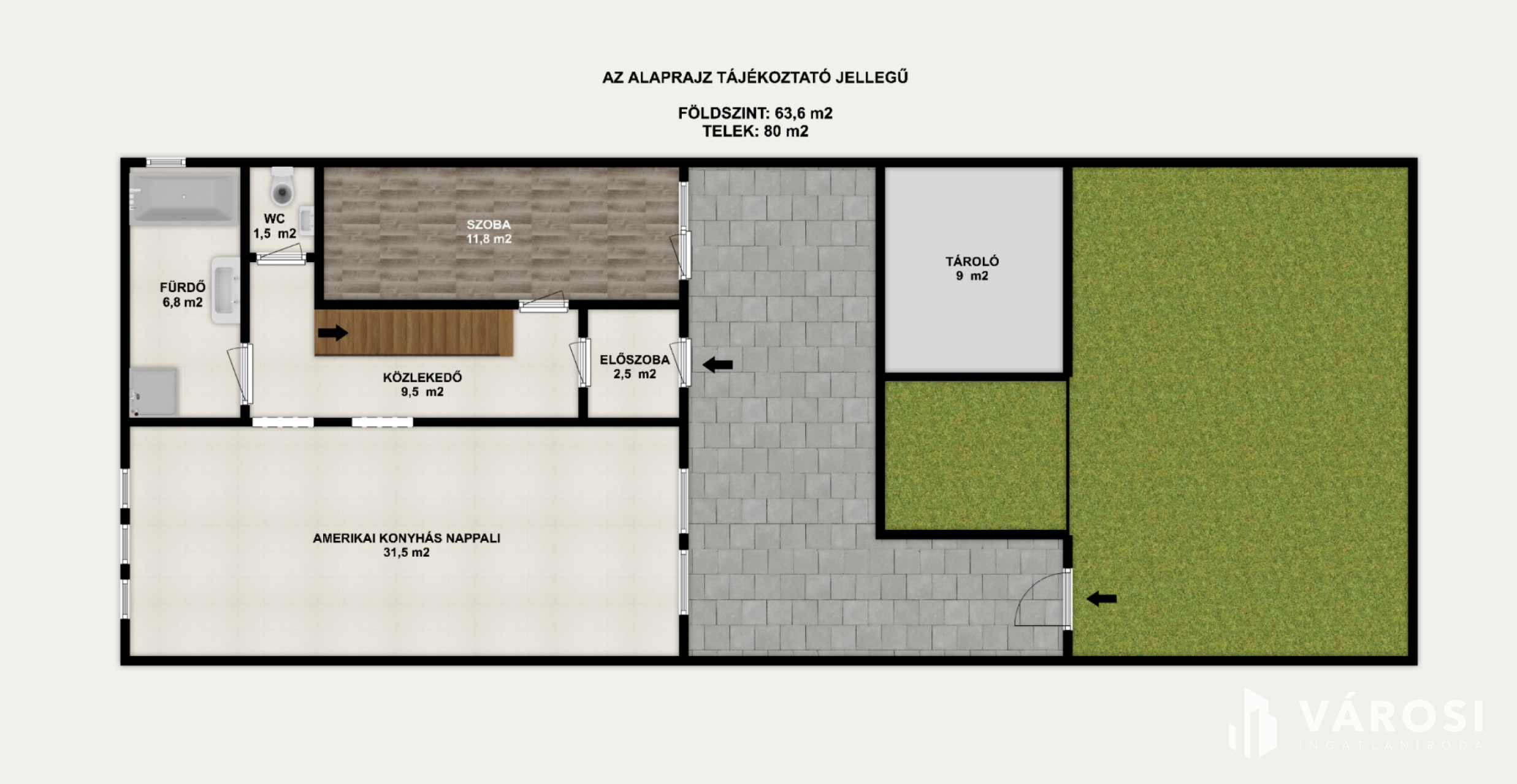 földszint: amerikai konyhás nappali (31,5 m2) + szoba (11,8 m2) + fürdőszoba (6,8 m2) + külön WC (1,5 m2) + közlekedő + előszoba