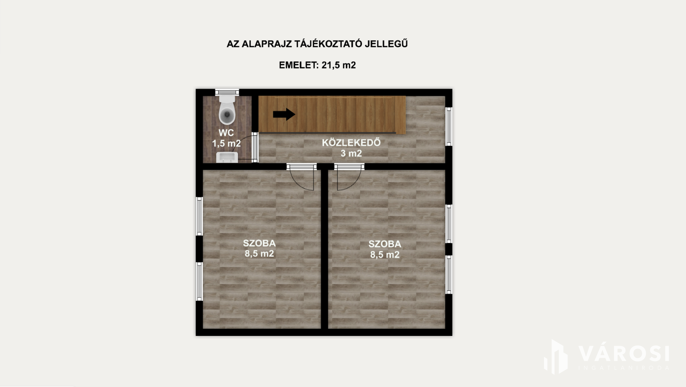 emelet: 2 hálószoba (2 x 8,5 m2) + WC (1,5 m2) + közlekedő (3 m2)