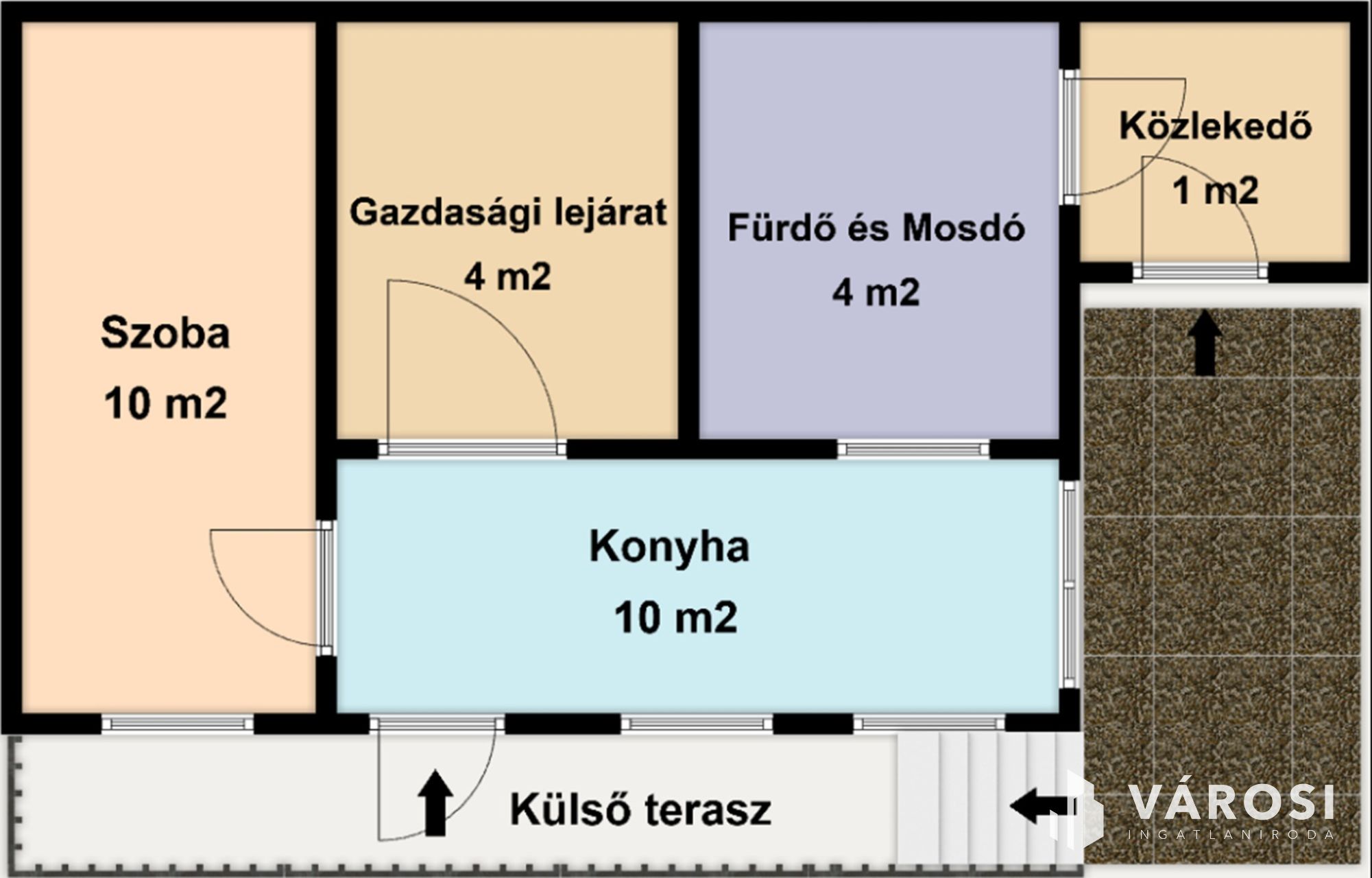 A ház elosztása a következő: külső terasz, konyha és külön szoba illetve kialakítható még egy fürdő és mosdó helység is.