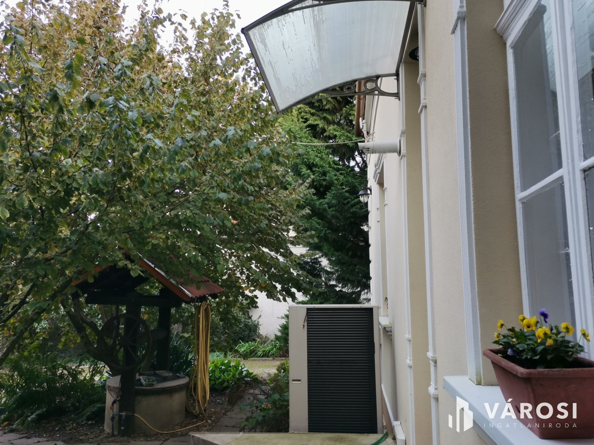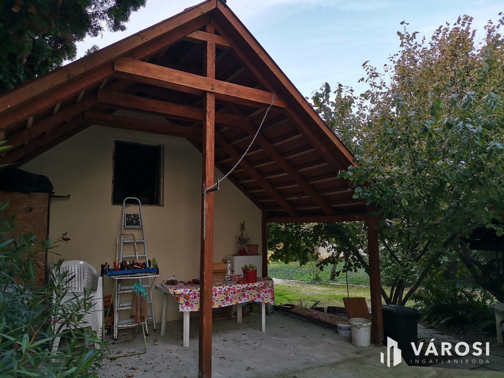Parkosított, romantikus kert veszi körül a házat. A ház mögött félig fedett terasz, garázs és hátul egy 3 autó számára alkalmas fedett beálló is van.