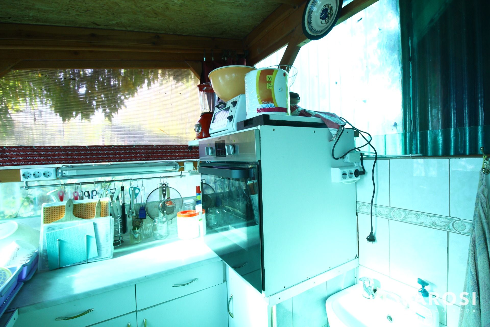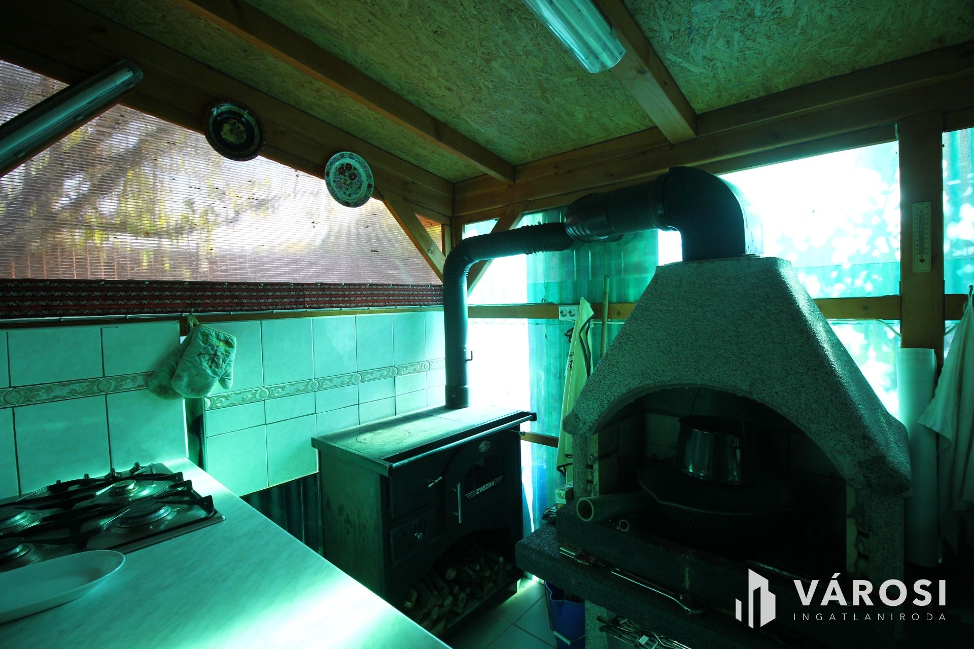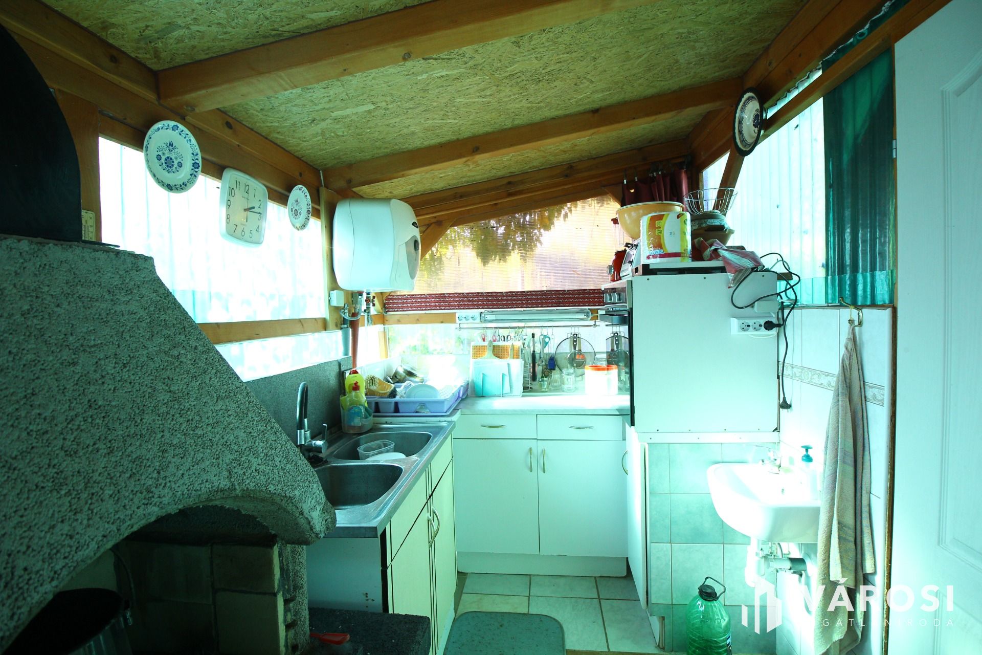 A kertben kialakítottak közvetlenül a dísztó és a sziklakert mellett egy összkomfortos nyári konyhát étkezővel 30m2-en ahol beépített tűzhely, sparhelt, kemence, sütő, grillező, mosogató stb. is beépítésre került. Mellette kényelmes kör panorámás 30 nm2-es ebédlő lett kialakítva, itt 18-20 fős társaság kényelmesen vendégül látható.
