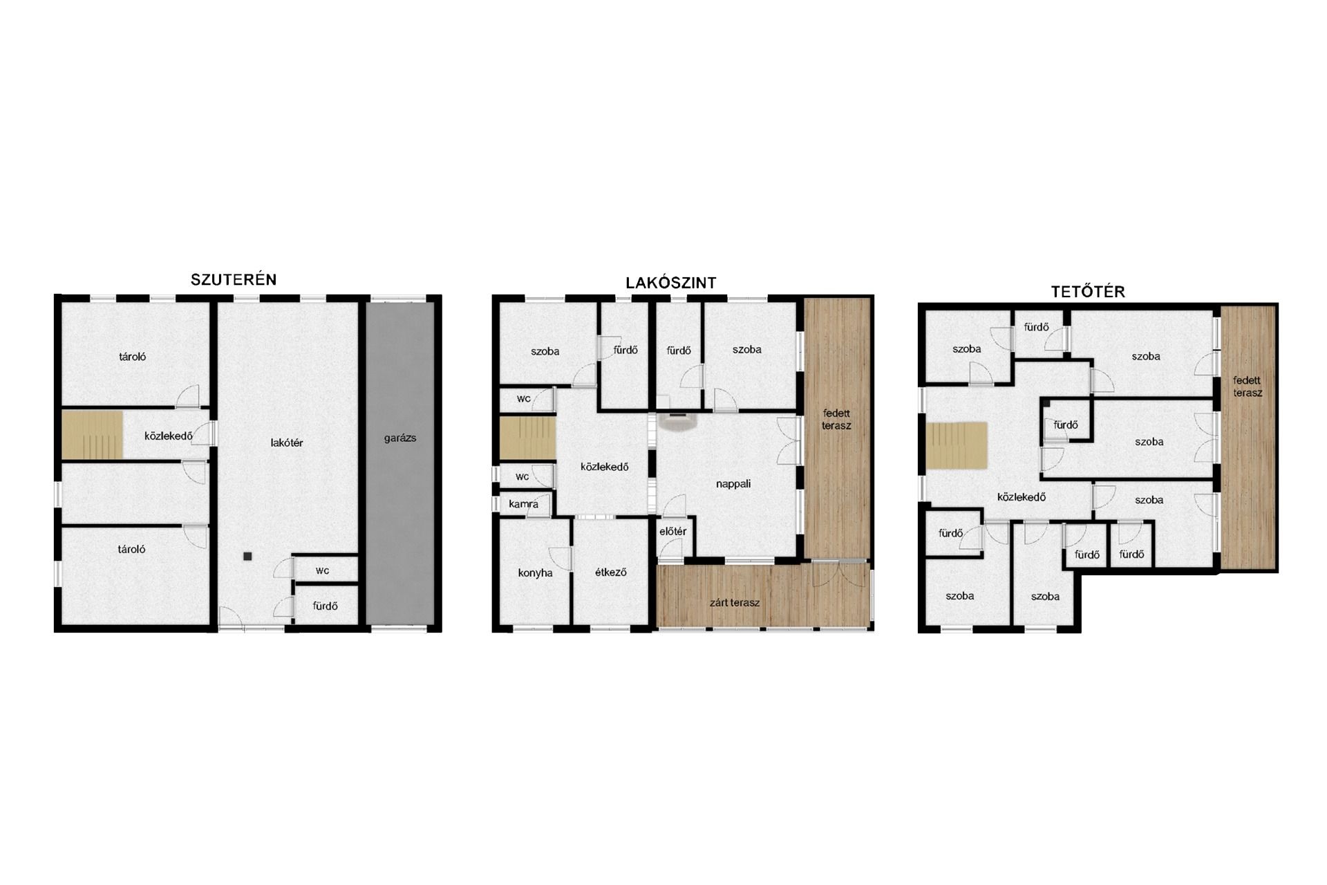 • Szuterén: Jelenleg különálló lakásként működik, de kiválóan alkalmas közösségi térként, ping-pong asztal, biliárd vagy egyéb játékok elhelyezésére. Ezen a szinten kapott helyet a nagyméretű garázs, a kazán, illetve két tárolóhelyiség is.