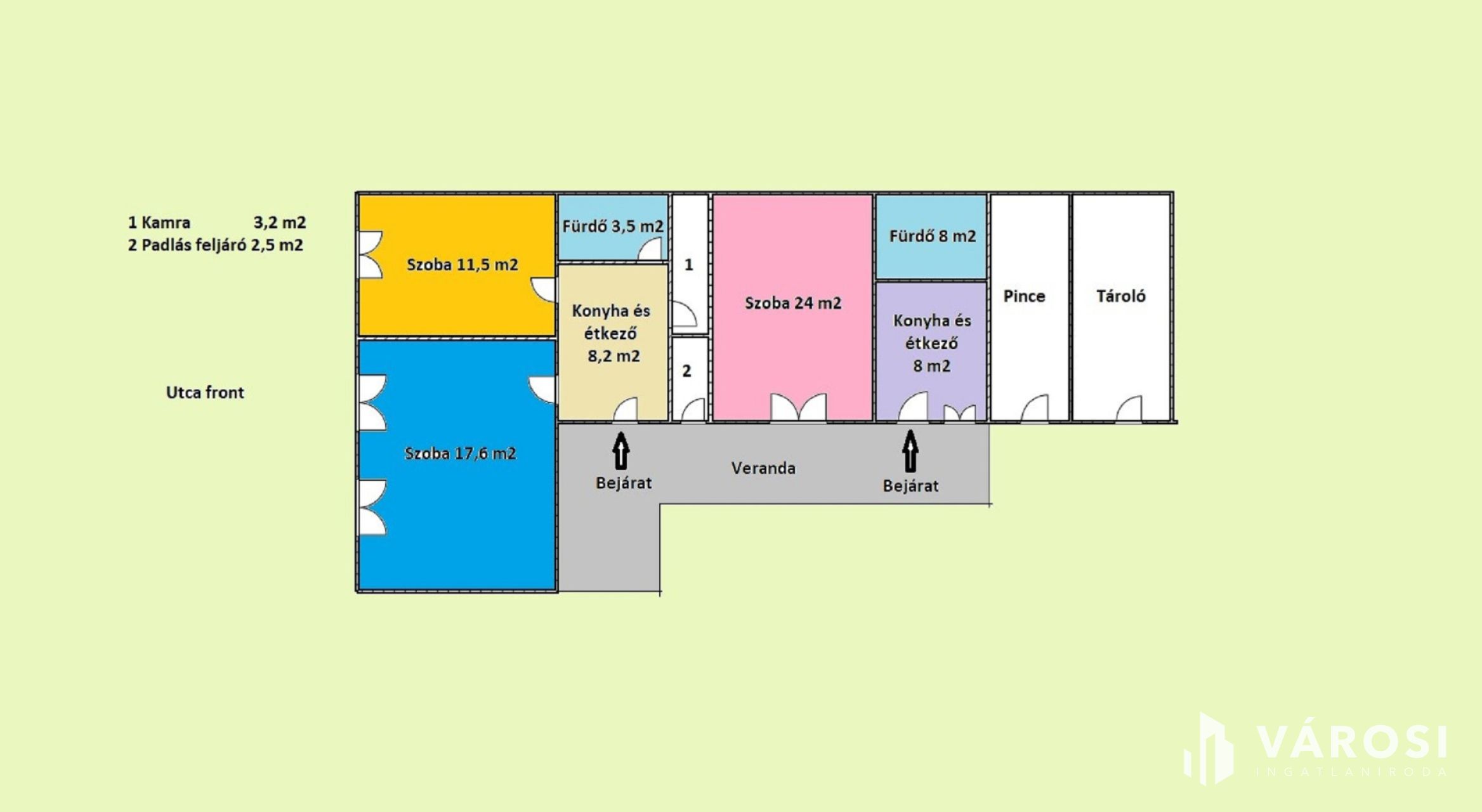 A ház jelenleg két külön lakásként funkcionál, külön bejárattal és két elektromos mérőórával, így ideális lehet nagyobb családnak, de befektetési célra is remek választás, hiszen a két lakrész külön-külön is könnyen kiadható – Budapest közelsége miatt garantáltan gyorsan bérlőre talál. Az első lakrész két hálószobát, konyha-étkezőt, fürdőszobát és egy kamrát tartalmaz. A hátsó lakrész egy tágas hálószobából, fürdőszobából, valamint egy szintén konyha-étkezőből áll. A fürdő és a szoba közé épített, hangulatos cserépkályha kellemes meleget biztosít, emellett a ház fűtése gázkazánnal és radiátorok hőleadásával történik.