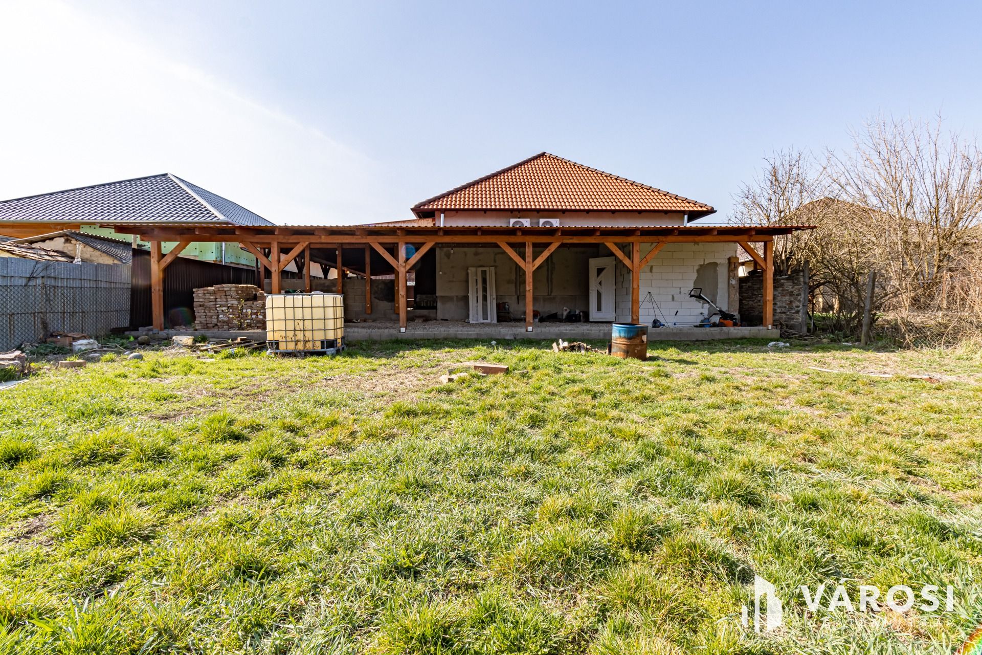 Teljesen új tetőszerkezet, bramac betoncserép héjazattal, teljes külső, padlófűtés alatti és lábazati szigeteléssel, a külső színezés még hátravan.