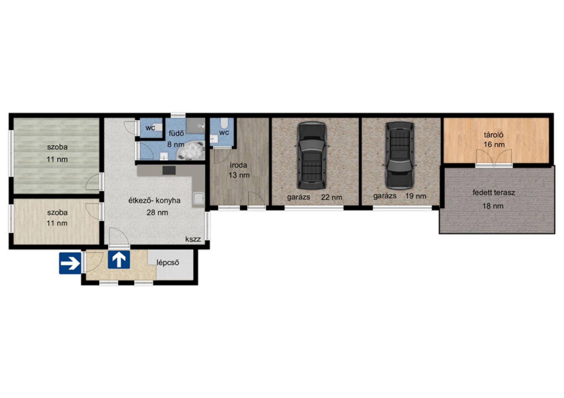 - 155 nm hasznos alapterület, belső két szintes épület.