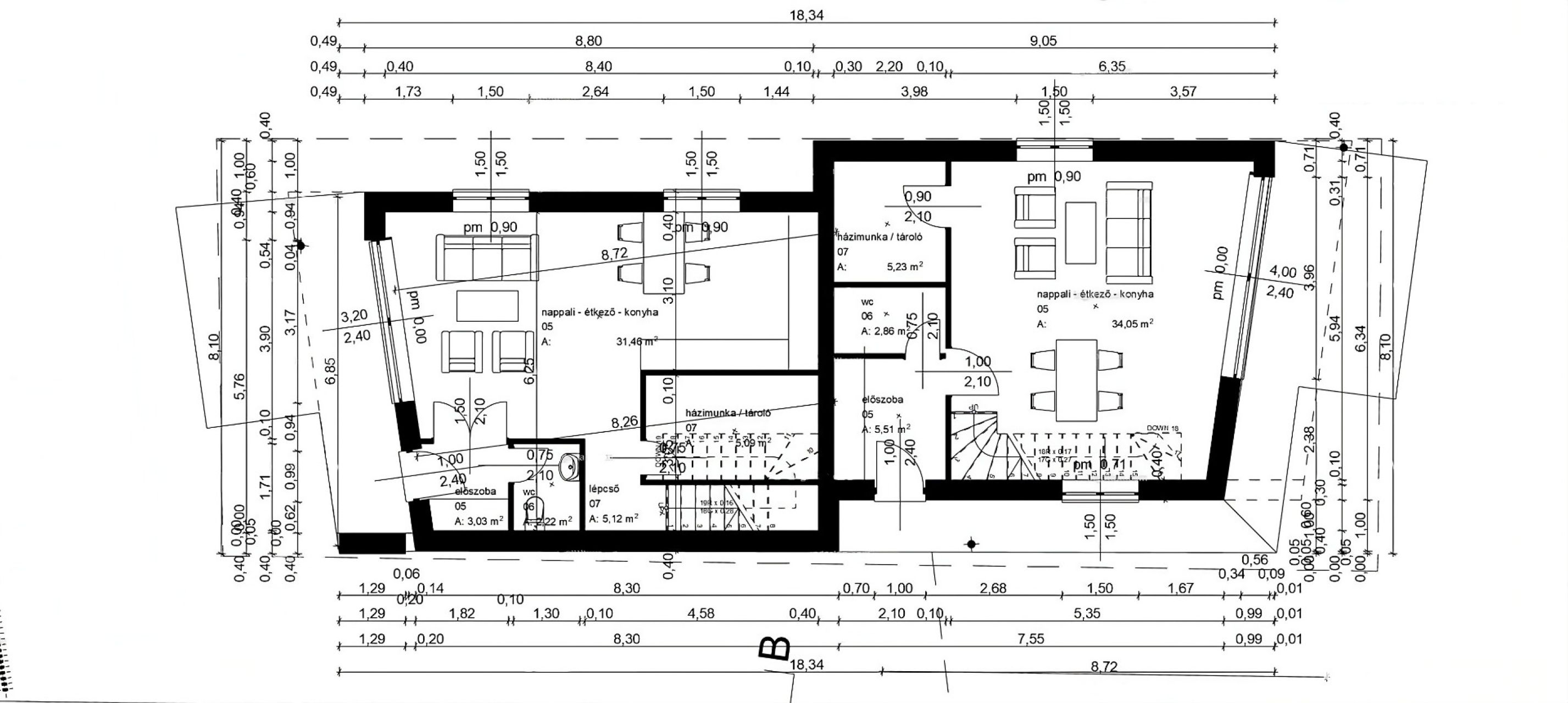 - Élettér: Az épület két szintes. Az alsó szinten egy tágas közvetlen kertkapcsolatos amerikai konyhás nappali található, amely tökéletes helyszín a családi összejövetelekre. Ezen felül a földszinten található az előszoba, egy tároló és egy wc. Az emeleten található három hálószoba, egy fürdőszoba, és egy erkély.