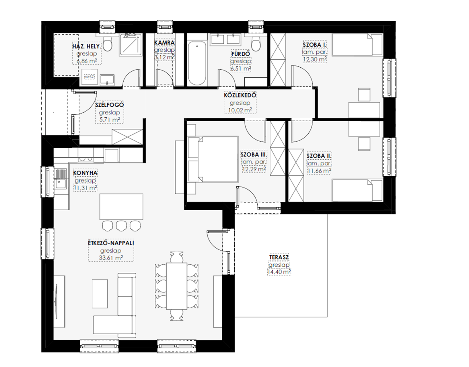Nyílászárók: háromrétegű hőszigetelt üvegezés a kiváló hő- és hangszigetelésért.