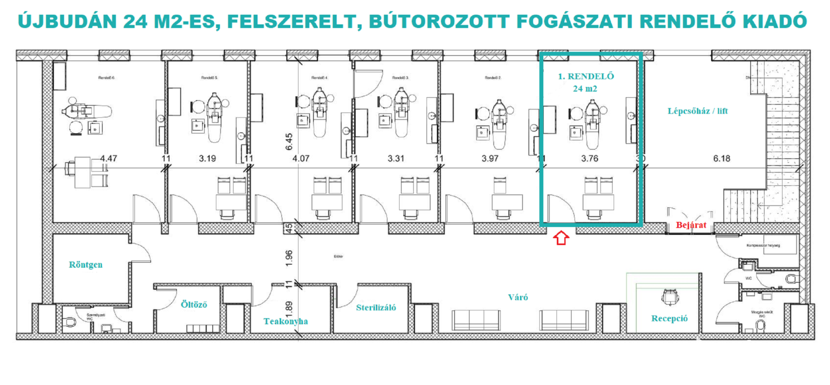 A komplexumban egymás mellett 6 rendelő kiadó, ez a rendelő 24 m2 alapterületű, teljesen felszerelt, Optimal 09 kezelőegységgel, fogászati eszközökkel és rendelői bútorzattal ellátott.