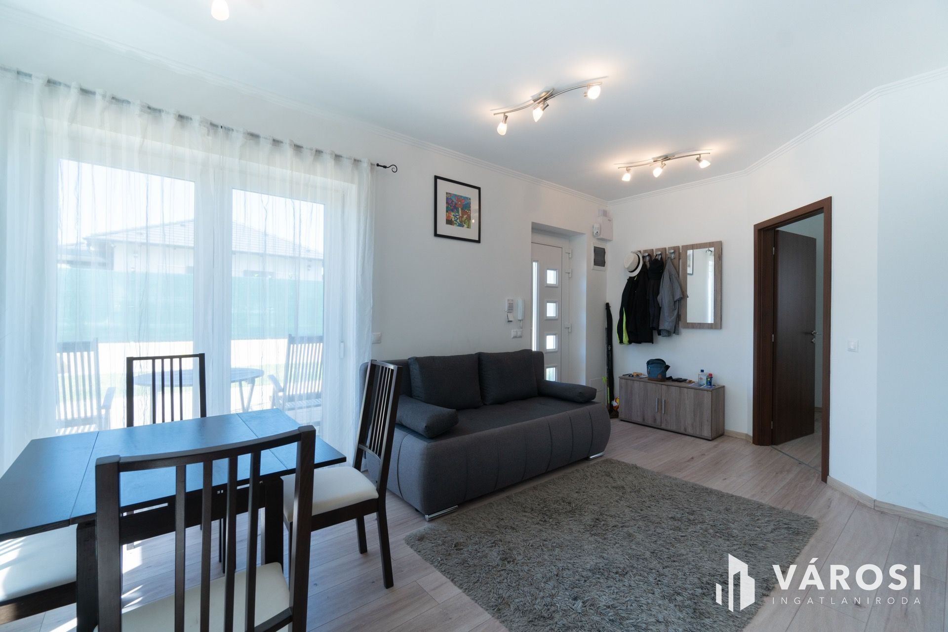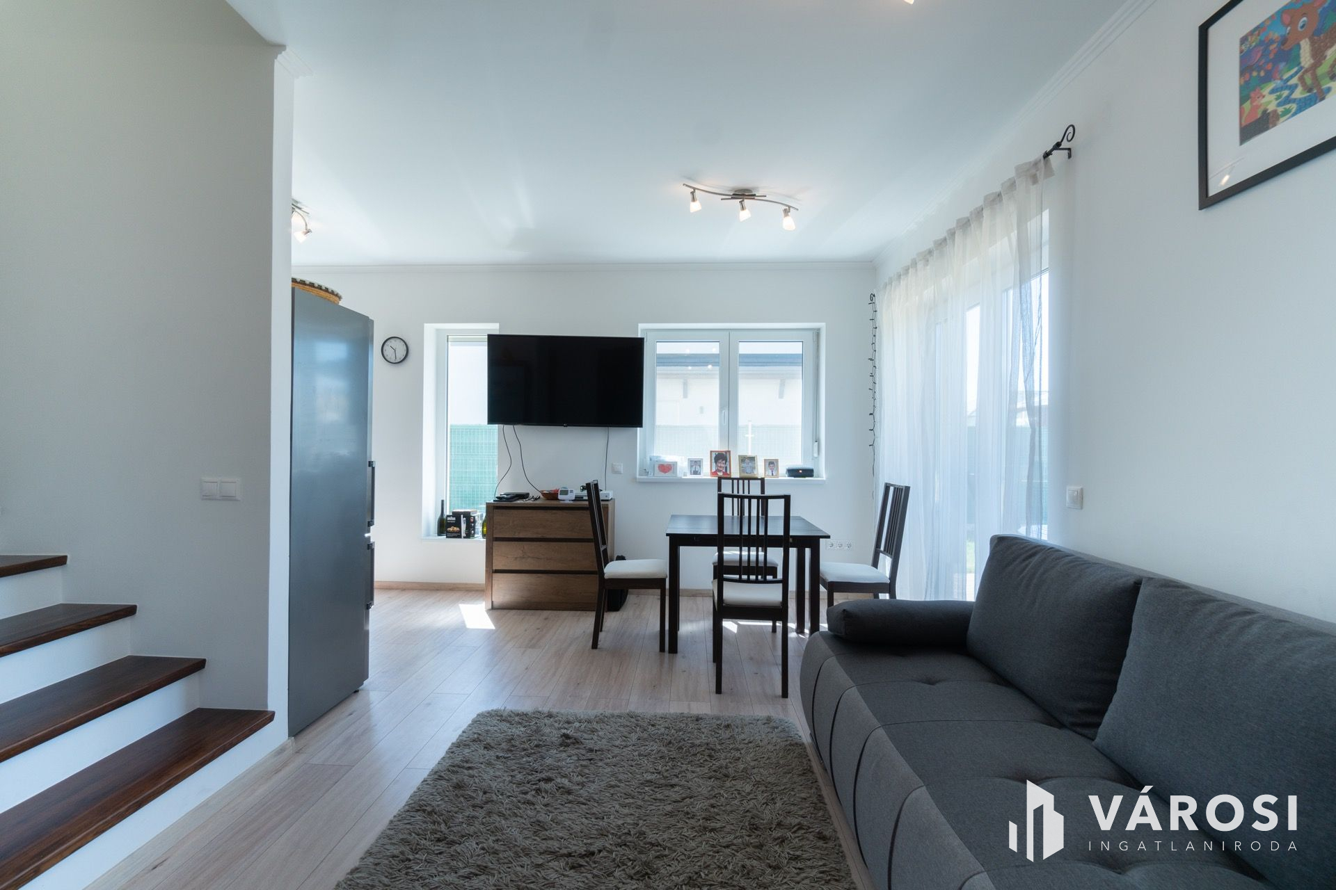 Siófok - Sóstó új építésű lakóparkjában első tulajdonostól eladó egy 2020-ban épült újszerű, kiváló állapotban lévő ikerház. Precízen átgondolt, rendkívül praktikusan megtervezett bruttó 107 m²-es házról van szó, melyhez 19 m² térkövezett terasz, egy 4 m²-es erkély, valamint udvaron belüli térkövezett gépjármű beálló tartozik. Az ingatlan külön helyrajzi számon van saját 266 m²-es telekhányaddal.