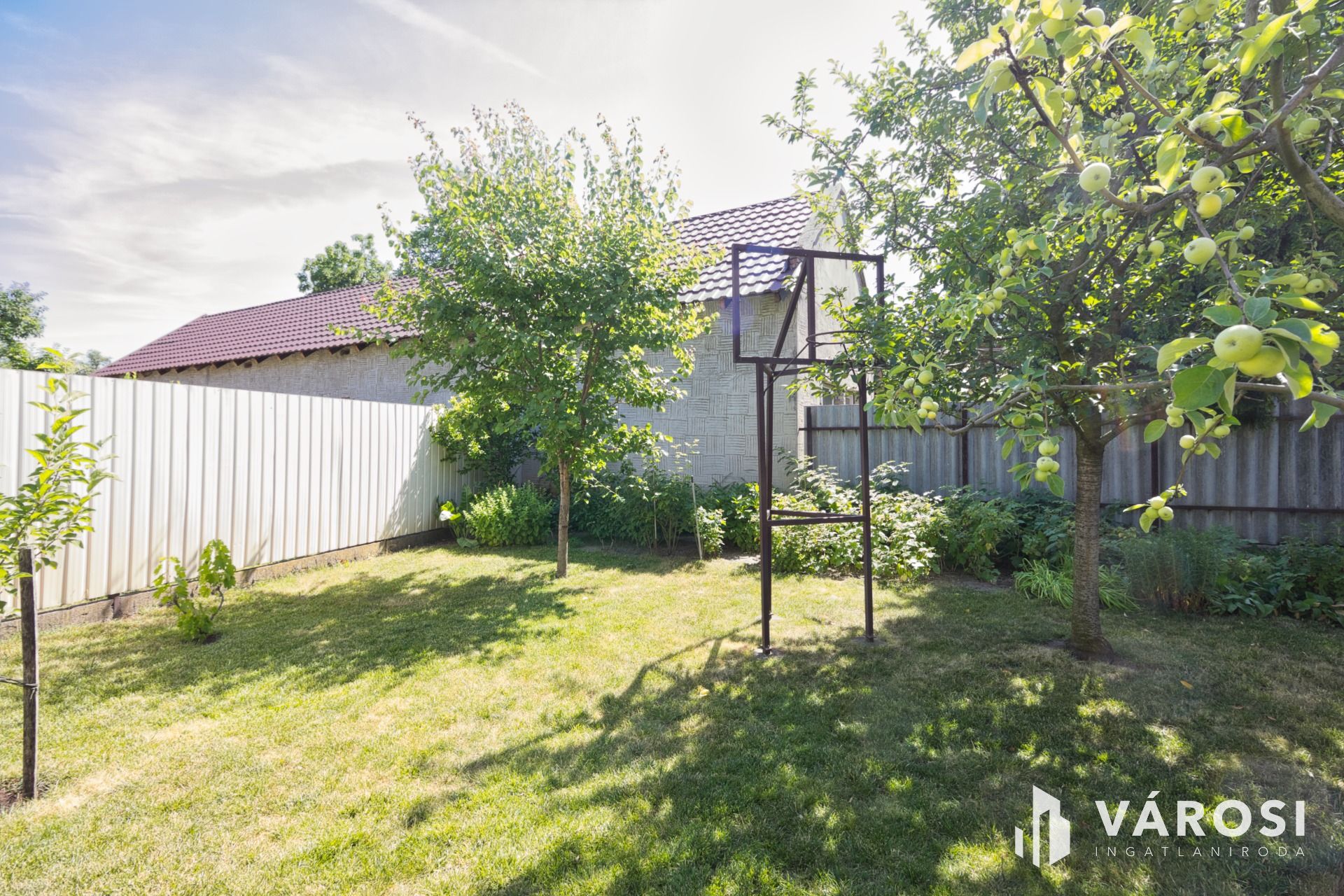 A ház mögötti udvaron termő bio cseresznye, körte, és füge biztosít gyümölcsöt a család számára. A locsolást 80 méter mélyre fúrt kút segíti. Az épület előtti kert gyönyörű virágaival pihentetően hívogató.