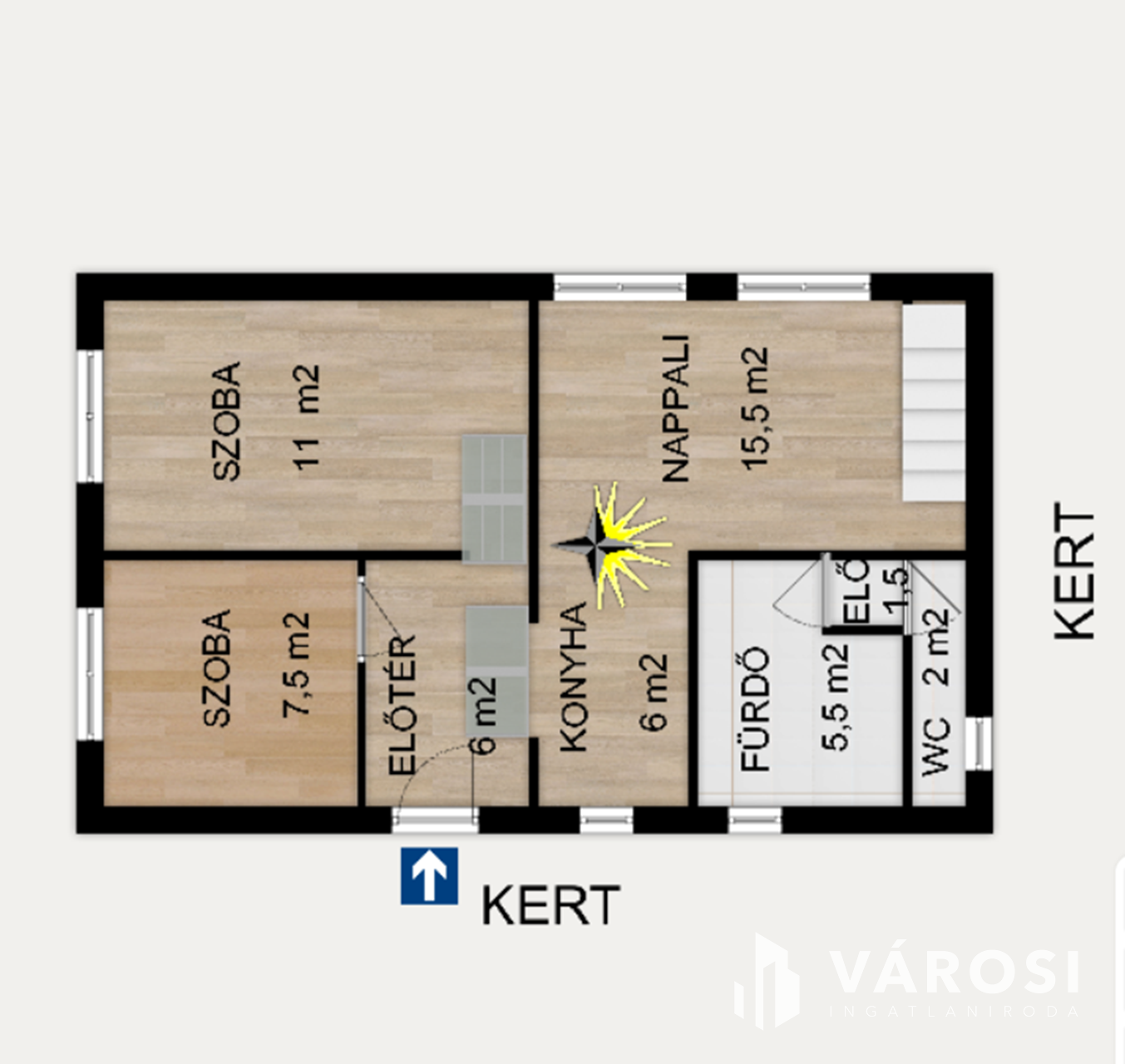 A szobák lamináltpadló burkolatúak, a többi helyiség hidegburkolatú.