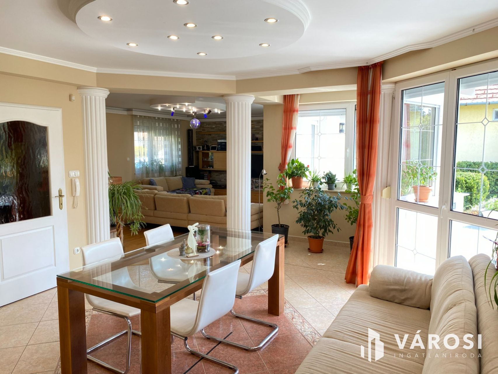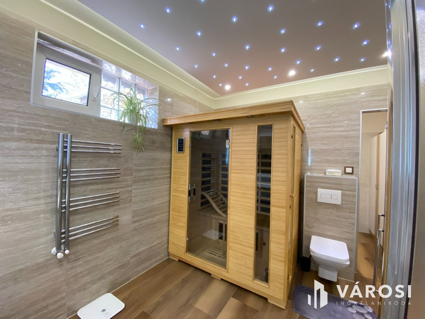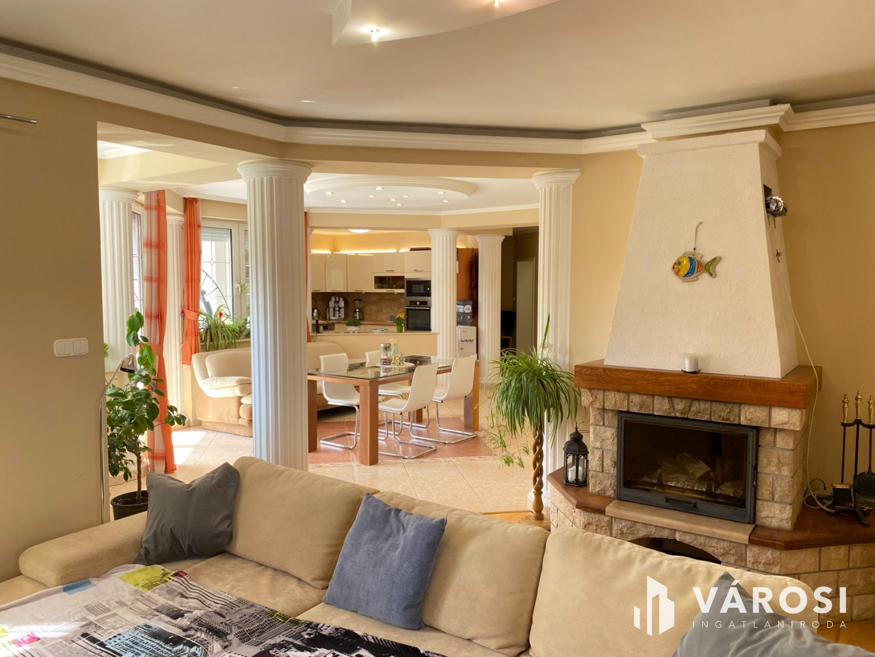A ház központi része az amerikai konyhás nappali, amely méretéből adódóan valódi élettérként működik, ráadásul a kandalló még otthonosabb hangulatot ad. A földszinten négy külön nyíló szoba található, valamint két zuhanyzós fürdőszoba és egy infraszauna is helyet kapott, így akár nagyobb család vagy több generáció együttélése esetén is jól használható.
