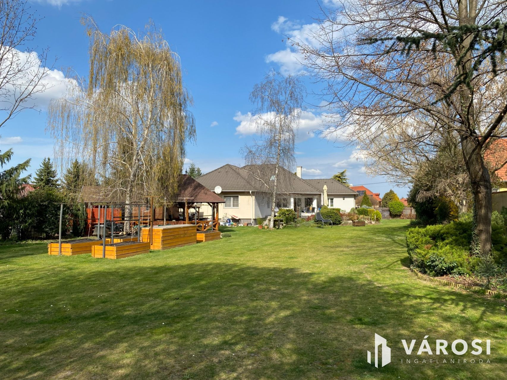 A szobák laminált parketta, a többi helység kerámia burkolatokkal rendelkezik. A házhoz egy nagy, kerámialappal burkolt terasz kapcsolódik, amely közvetlen kapcsolatot teremt a kerttel, emellett praktikus és pihenésre is alkalmas. Automata öntözőrendszer, kerti pavilon, szerszámtároló, bográcsozási lehetőség és magaságyások is kialakításra kerültek. A teljes terület parkosított, rendezett.